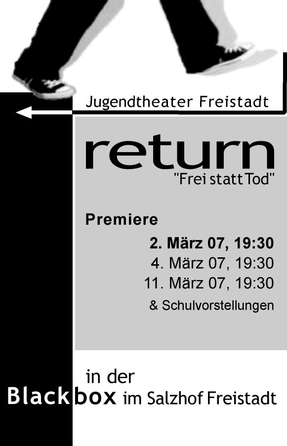 dates28.02.2007 – Cafe Strom, Linz – Gegen den Strom Gegen den Strom – 28.02.2007 – Cafe Strom, LinzElektronische Musick jeden Mittwoch im Cafe Strom Es residieren die DJs Aka Tell, Lena, Martin Klein Visuelle Gestaltung Francesca, Leonardo, Mes., Ruffex Eintritt frei! Beginn: 21.00 Tube Klub – 01.03.2007 – Jazzit, SalzburgCherry Sunkist Odd and Aka Tell Ken Hayakawa “return†Jugendtheater Freistadt – 02.03.2007 – Salzhof, FreistadtPremiere des Jugendtheaterstuecks von Markus Luger. Inhalt: Selbstbestimmung, Angst, Liebe, Freundschaft sind zentrale Themen im Stueck â€Å¾returnâ€Å“. Dazu die einfache, aber eindringliche Frage â€Å¾Warum nehmen Jugendliche sich das Lebenâ€Â¦ â€Â¦und gibt es Strategien, das zu verhindern?â€Å“ Das Stueck kann Anstoss zu Diskussionen und Ueberlegungen geben, wie eine moegliche Antwort auf diese Frage aussehen koennte. Waehrend der Arbeit hat sich dazu in der Gruppe ein Satz heraus kristallisiert: “Suizidverhuetung beginnt dort, wo sich zwei Menschen begegnen!†Freies Radio Freistadt = !!! ZWEI !!! – 02.03.2007 – LOCAL-BUeHNE Freistadt | Foyer!!! radio FRF = ZWEI !!! PARTYTIME ab 21 uhr | HOTEL BALKAN | eintritt frei moderation: simone boria | nachtportier: josef gaffl (backlab) No Comment ‘Heimspiel‘ – 03.03.2007 – Posthof, LinzDrummnbassfloor: DJ: confuzed (zive), contact (szsz), dubrider (zive), emix (buccaneer rec., chemotaxis), glyon (szsz), infame (mainframe), max powa (wea-sound), ndl (morphed), ricochet (flowers), sagishi (zive), sata-man (wea-sound), snu (weltrecord), shroombab (junglistic sistaz), yak (szsz, flowers), yoko (dgtl42), mc rascal (dgtl42) Visuals: leonardo (backlab) Breaksfloor: raza (weltrecord), hulk (soundoptic), malvin (rotations), stefan viehboeck (backlab) 03.03.07. Posthof, Linz Entry: € 9/11 Black Box – 03.03.2007 – Arge Kultur, SalzburgTNT Jackson DJ Michael Fakesch (Funkstoerung/K7!) Odd vs. Aka Tell Visuals: strukt HOTEL BALKAN radio show – 09.03.2007 – Radio Fro & Radio FRFthe wired intercultural radio show | 21.00 – 22.00 uhr (CET+1) radio FRO linz 105,0 MHz | radio FRF freistadt 107,1 MHz live streaming l programm | music | photos | download section Kingdom of Illusions #39 – 09.03.2007 – Cafe Strom, Linz